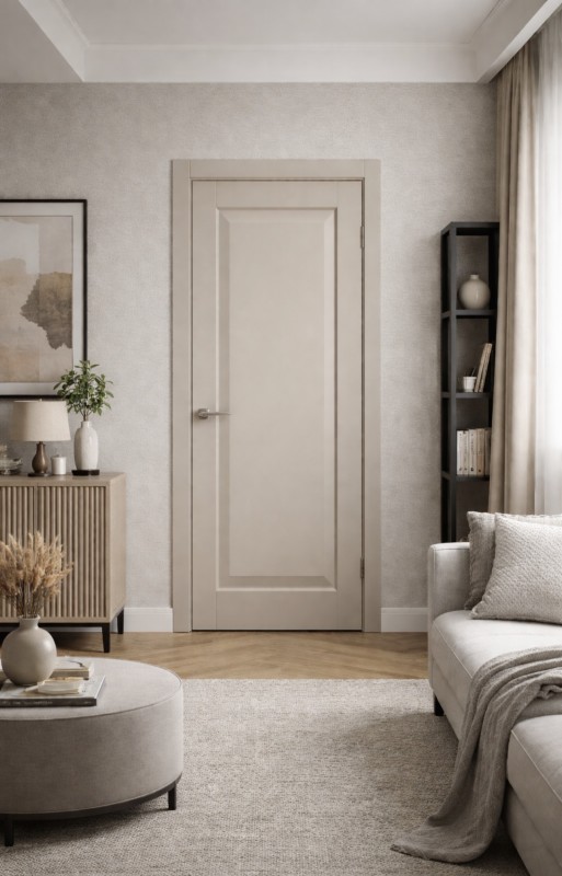 Межкомнатная глухая дверь рамочной конструкции с объёмной филёнкой.
