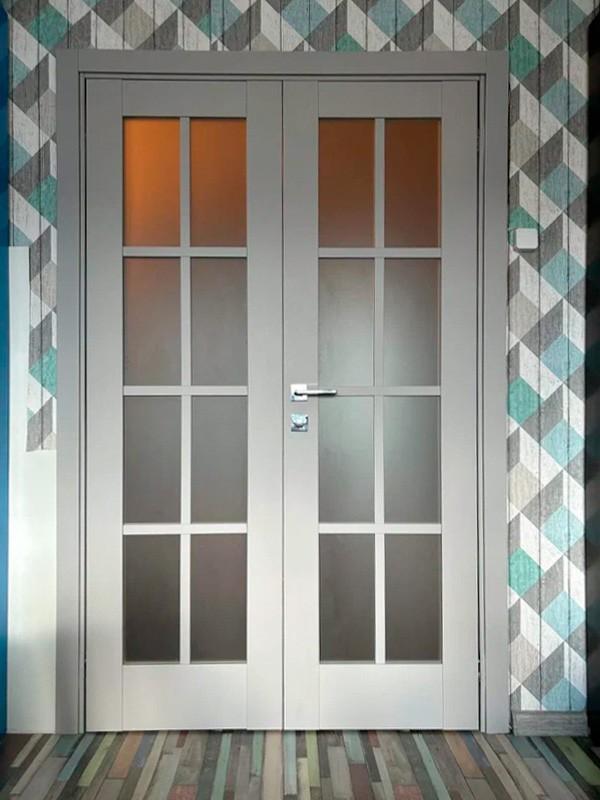 Межкомнатная остеклённая дверь рамочной конструкции с объёмной филёнкой.